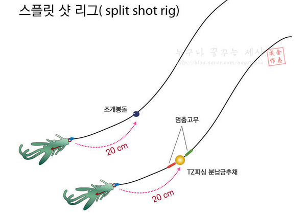 - 스플릿샷 싱커를 훅 위 약 30~50cm 지점에 고정